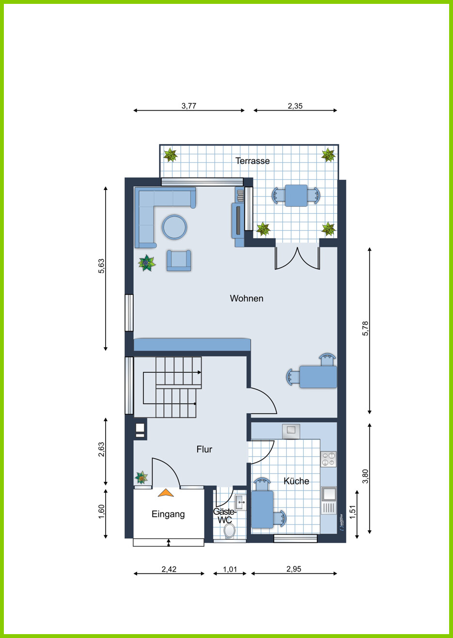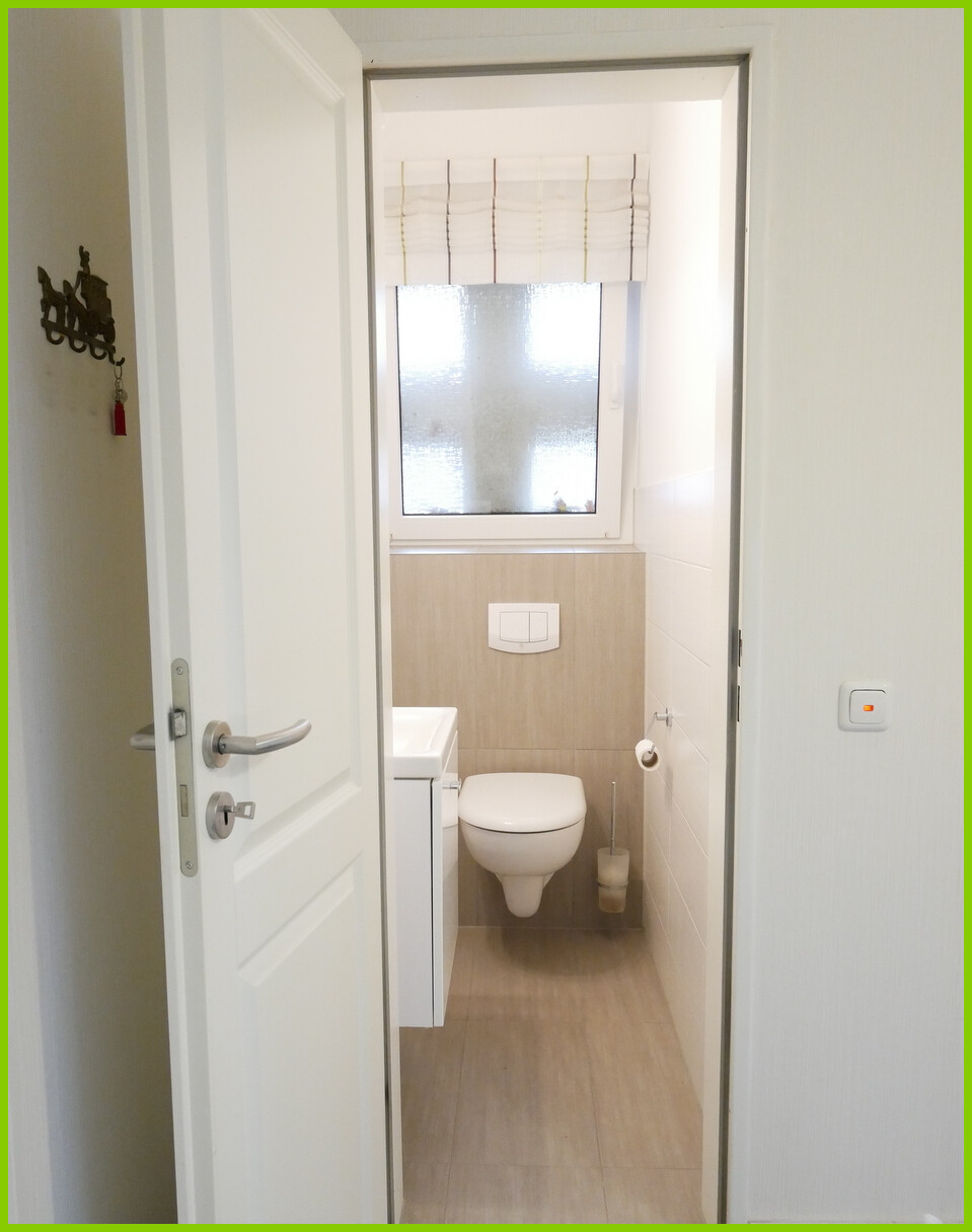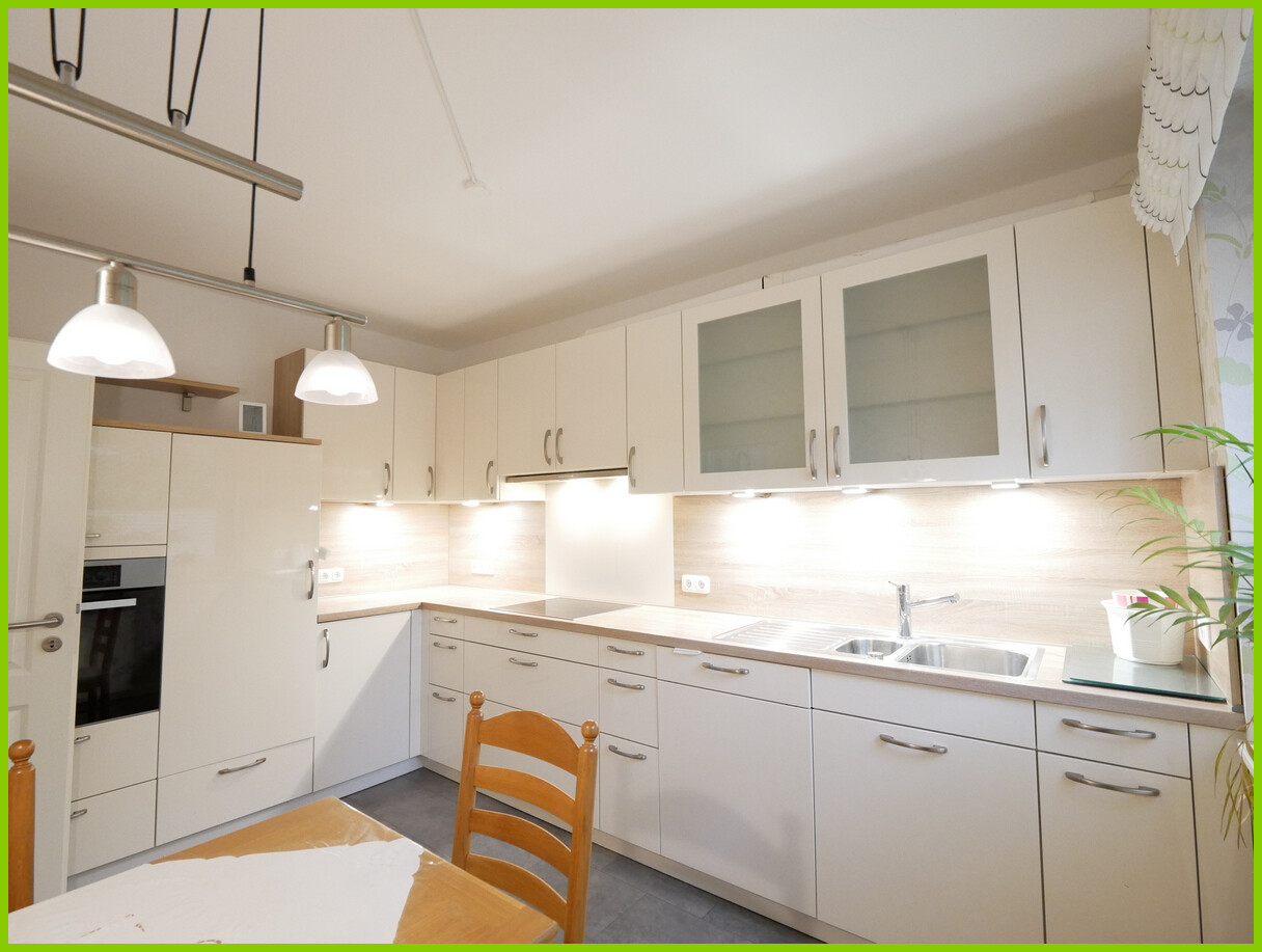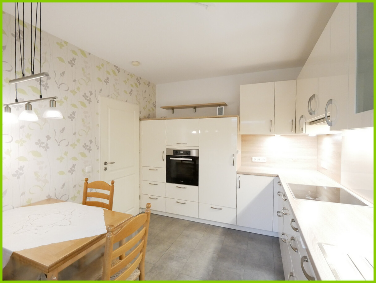 Die moderne Einbauküche ist hochwertig ausgestattet und verfügt über viel Stauraum sowie Arbeitsfläche und noch Platz für eine kleine Sitzecke– ideal für alle, die gerne kochen. Ein gepflegtes Gäste-WC komplettiert das Erdgeschoss.
