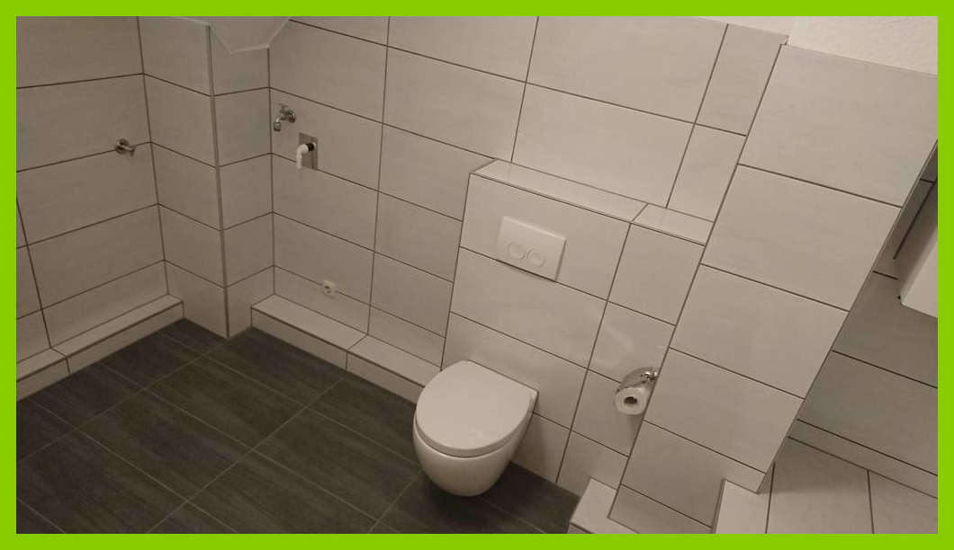 Das Badezimmer ist mit modernen grauen Fliesen ausgestattet und verfügt über eine Badewanne. Die Küche ist modernisiert und mit einer neuen Einbauküche ausgestattet, inklusive Kühl-Gefrier-Kombi und Geschirrspüler.