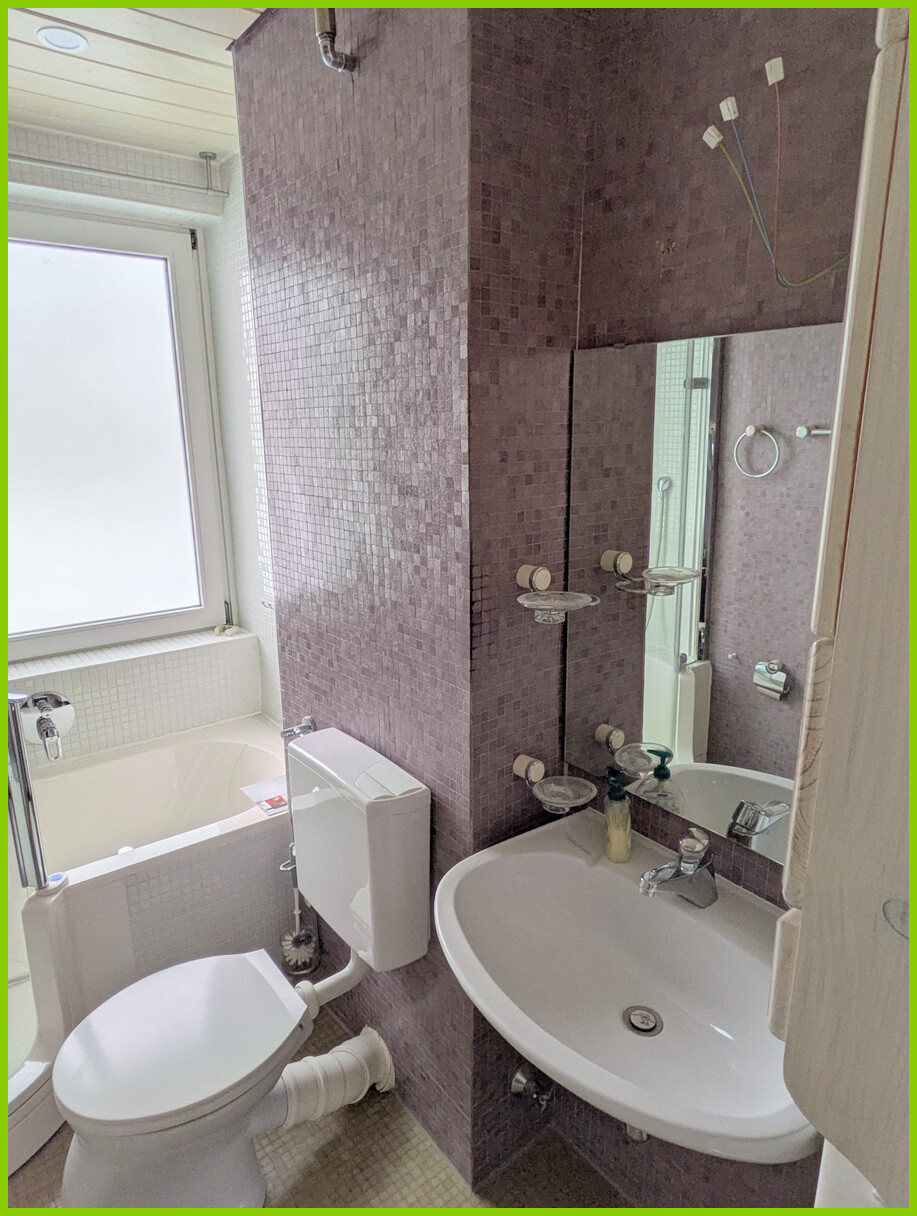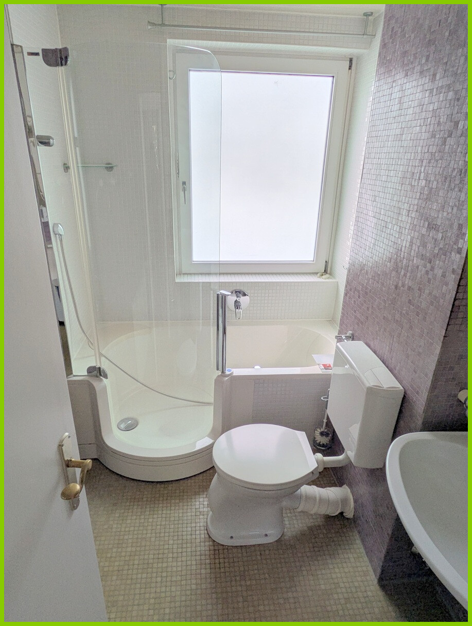 Das Badezimmer ist modern gestaltet und verfügt über eine Badewanne mit Duscheinstieg sowie ein Fenster für Tageslicht und Lüftung. Die Warmwasserversorgung erfolgt über einen Durchlauferhitzer.