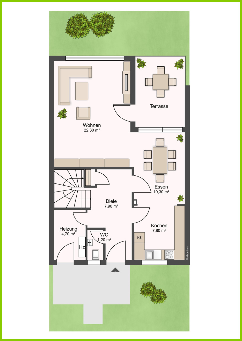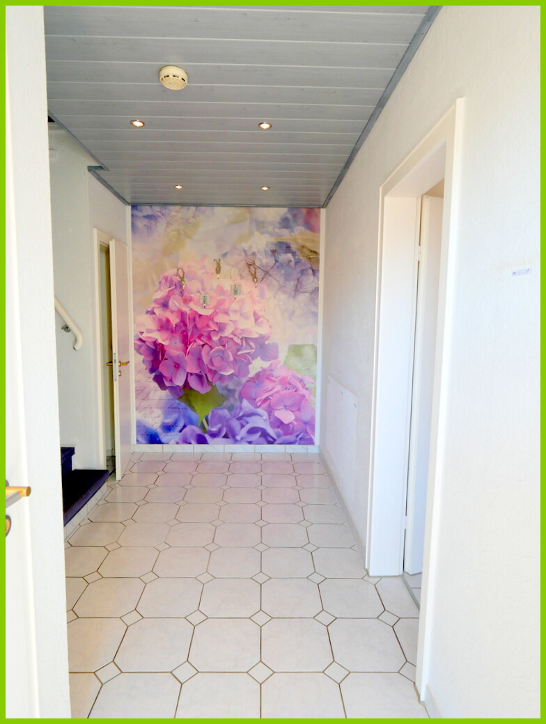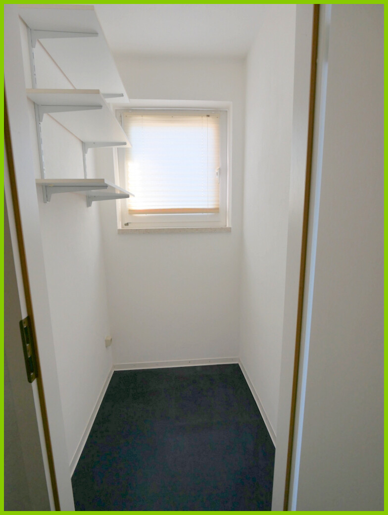 Direkt vor dem Haus liegt der eigene Stellplatz. Im Inneren gelangt man zunächst in einen hellen Flurbereich, in dem sich gleich zur Linken ein Gäste-WC befindet. Eine Tür weiter gelangt man in den praktischen Hauswirtschaftsraum, in dem sich auch die Gasheizung befindet und der über einen eigenen Ausgang nach draußen verfügt – ideal als Schmutzschleuse für Kind oder Hund.