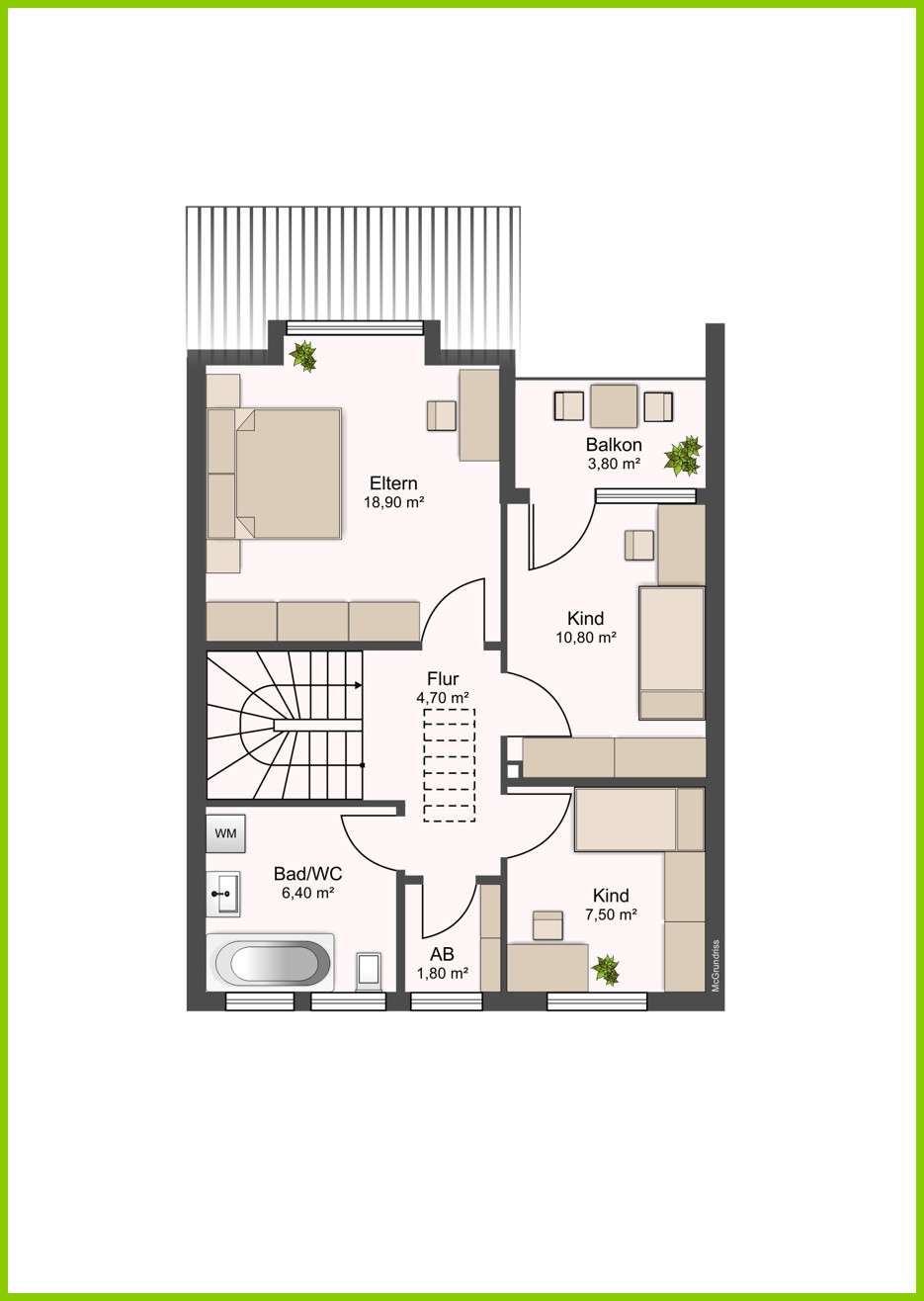 Über eine kleine Treppe gelangt man in den als Nutzfläche ausgebauten Dachboden, der ausreichend Stauraum für die ganze Familie bietet.